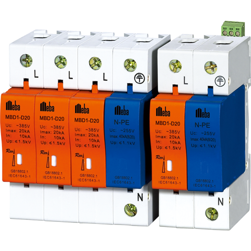 MEBA Lightning Australoristas MBD1-D20(en adelante llamado SPD)se usa adecuadamente en el sistema de suministro de alimentación IT, TT, TN-C, TN-S, TN-C-S y etc..Según las condiciones de IEC61643-1: 1998-02 Estándar, Dispositivo protector de sobretensión de Clase III, es un dispositivo protector de aumento de la categoría D.SPD tiene dos modos de protección: MC y MD